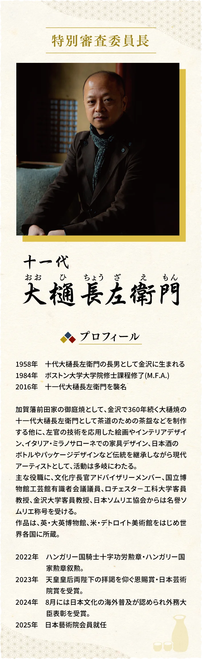 今後の日本における芸術の発展および建設技術の発展を願い、アイ工務店と十一代 大樋長左衛門氏とのコラボにより開催。 芸術・建設系学生の創造力の支援を目的に、日本国内の大学・専門学校に所属する学生より日本酒ボトルデザインを募集します。