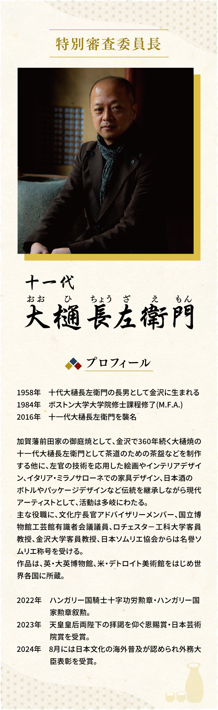 審査員 | 審査委員長:十一代大樋長左衛門 審査員弊社デザイン担当:執行役員藤原広行他1名 |