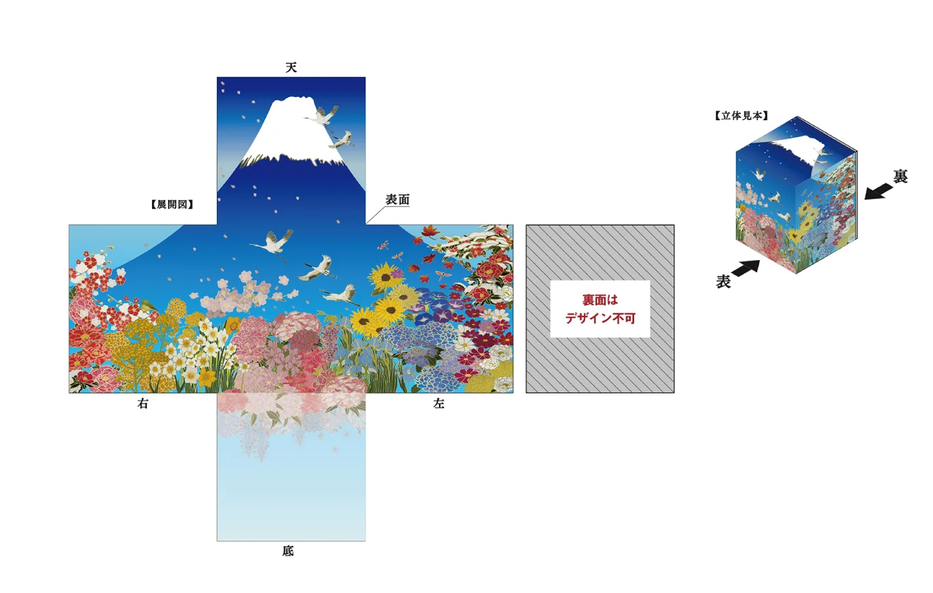 富士山の麓には、四季折々の草花が色鮮やかに咲き誇り、小鳥やトンボ、生涯パートナーや家族と暮らすとされる鶴が空を舞っています。