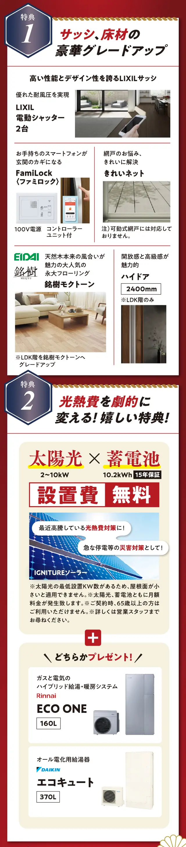 構造躯体・防水・防蟻には、最長70年の長期保証システムをご用意。定期点検と、30年目以降の必要なメンテナンス工事を行うことで、長く安心してお住まいいただけます。