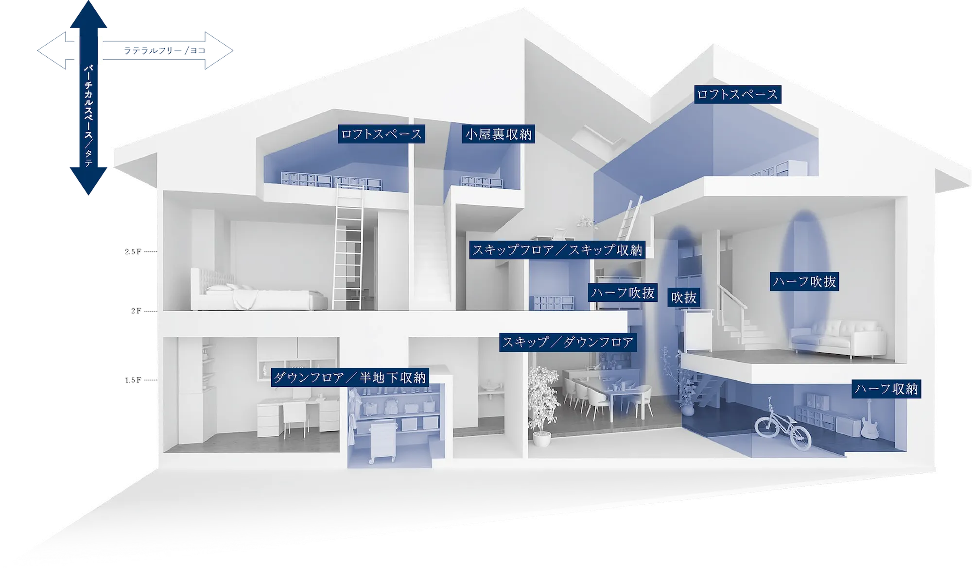 1.5階、2.5階など上下階の間に設けたプラスアルファスペース。空間をタテで捉えれば、住まいの可能性が広がります。