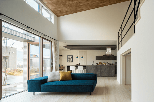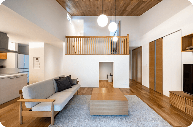 大空間や開口を作ったり、天井を高くとったり、勾配天井にすることで、ワンフロアでも心地よい解放感を演出します。
