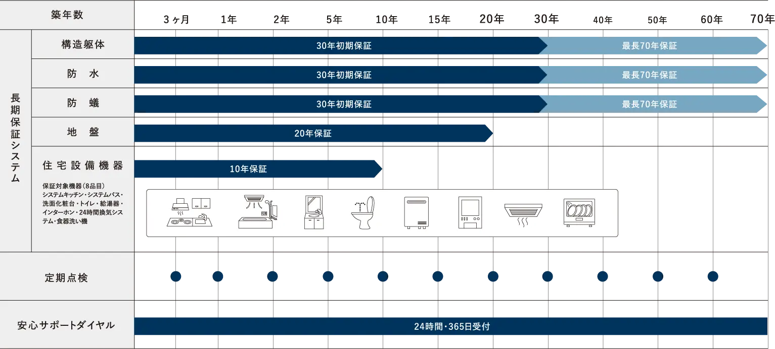 構造躯体・防水・防蟻には、最長70年の長期保証システムをご用意。定期点検と、30年目以降の必要なメンテナンス工事を行うことで、長く安心してお住まいいただけます。